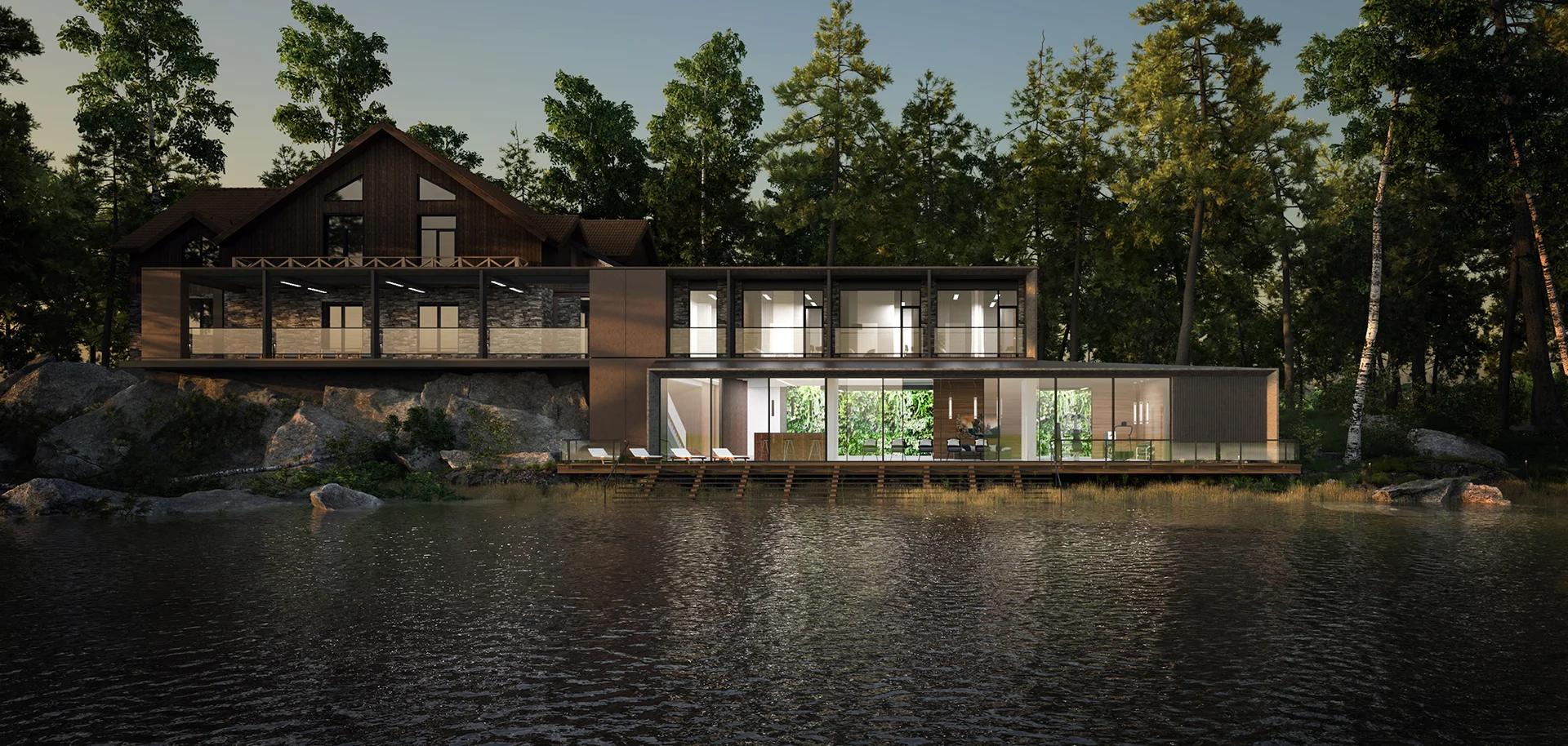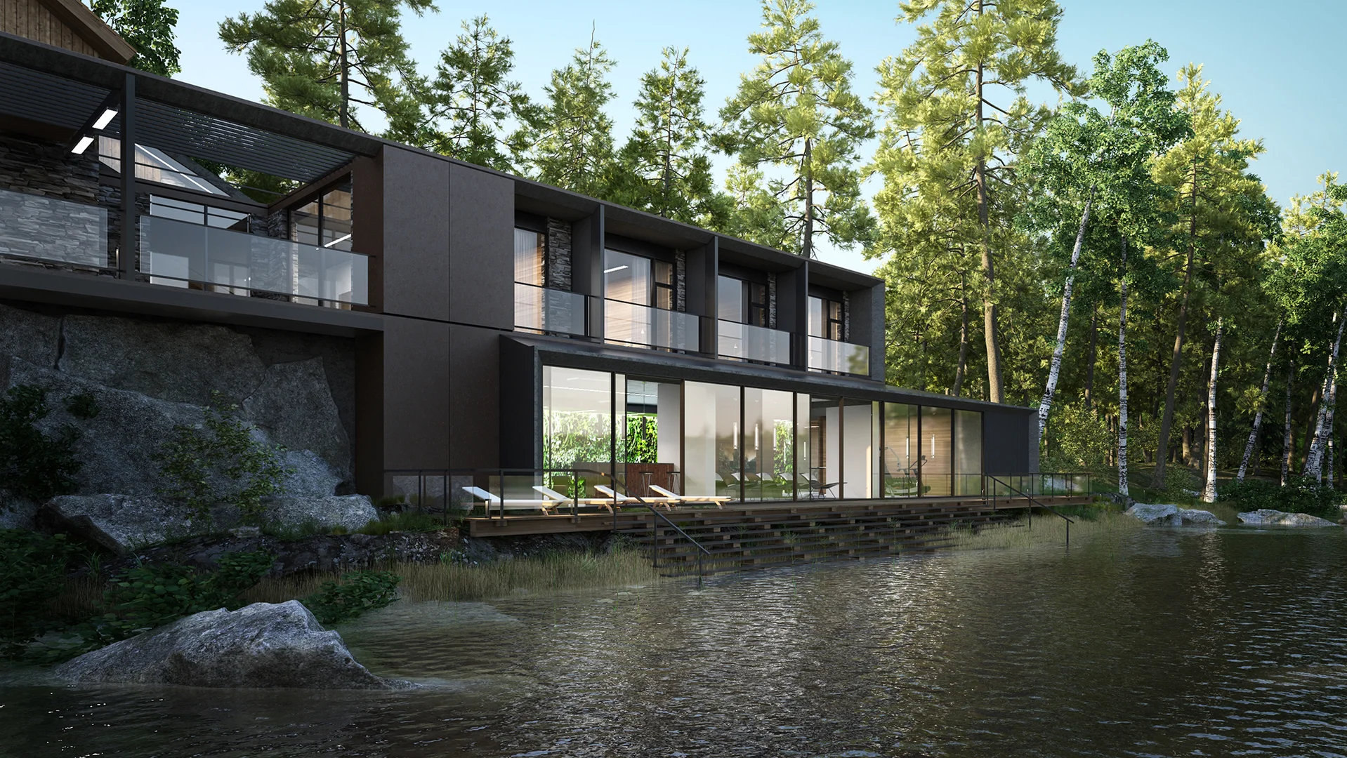 Private pool and spa with lakefront guest rooms. The building complex includes a 25-meter swimming pool, saunas and a spa, as well as 3 guest rooms. The facade is made of concrete and corten steel.