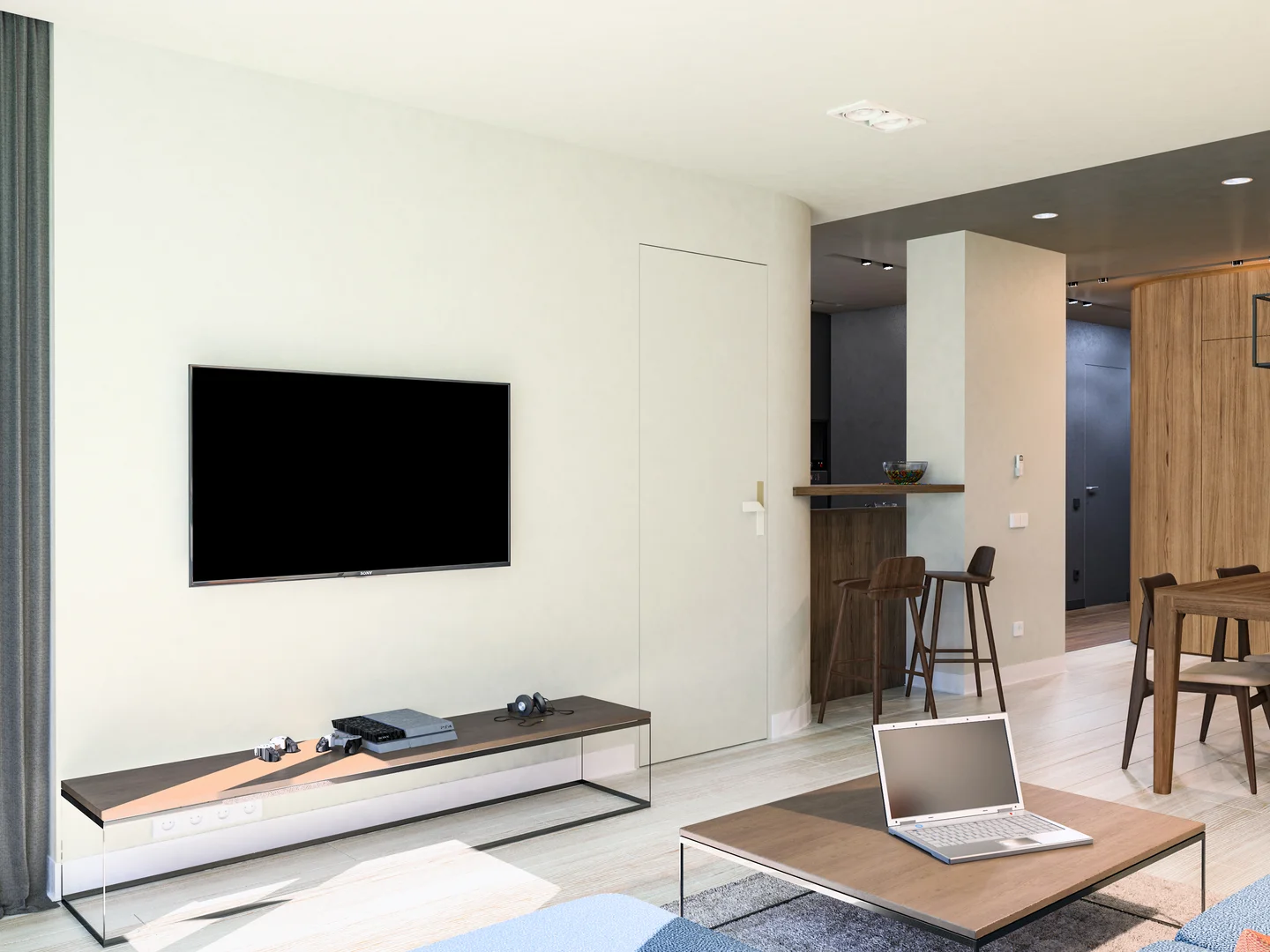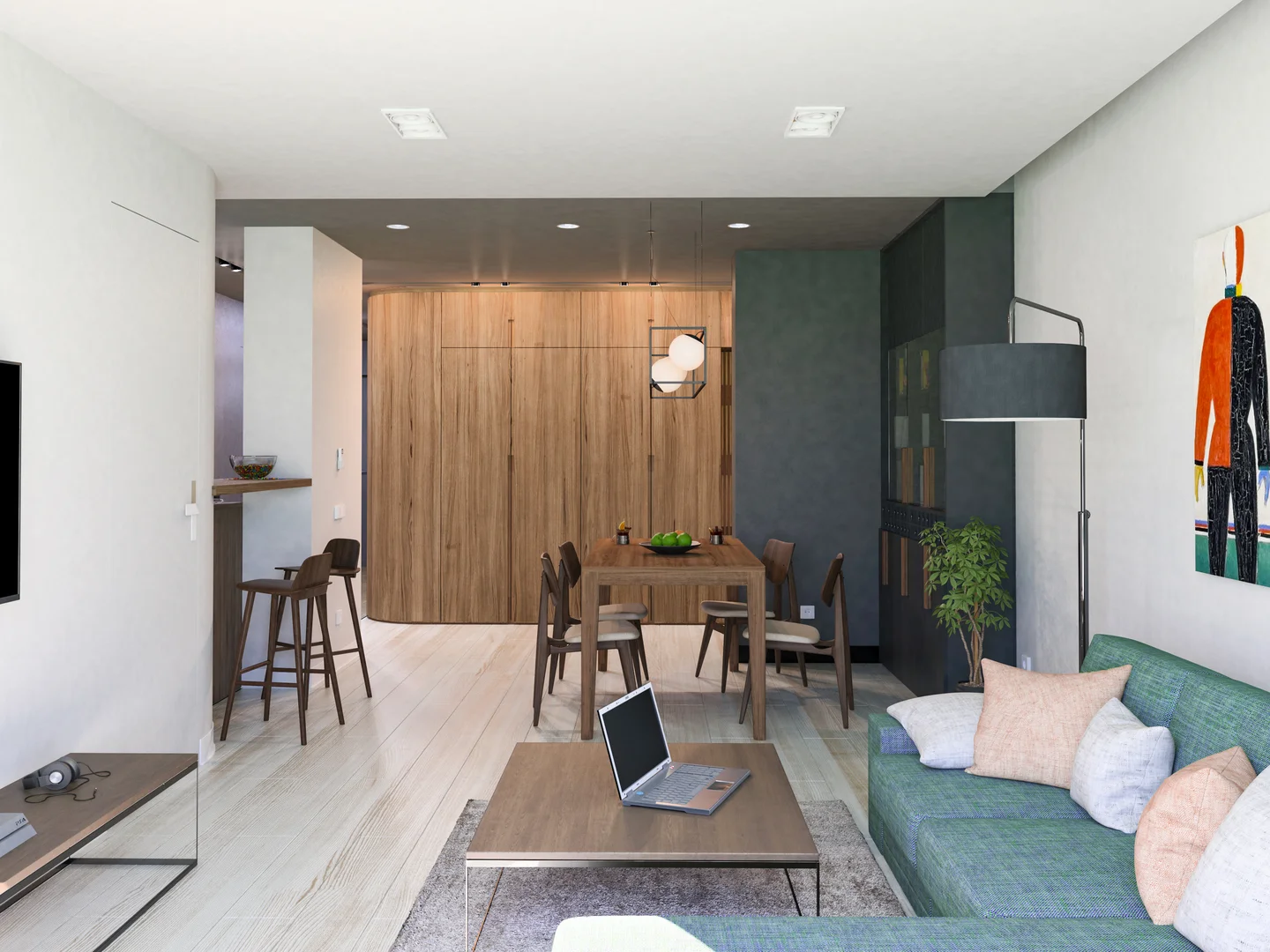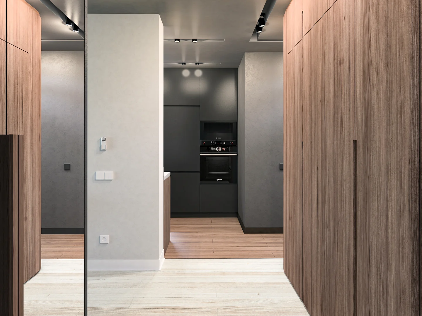 This minimalist apartment design features gently rounded walls and cabinetry, creating a light, airy atmosphere within a compact and carefully considered layout. The introduction of an additional bedroom required relocating the kitchen to the rear of the apartment. This constraint became an opportunity to explore a more expressive design approach, transforming the challenge into a distinctive rounded feature that defines the space.