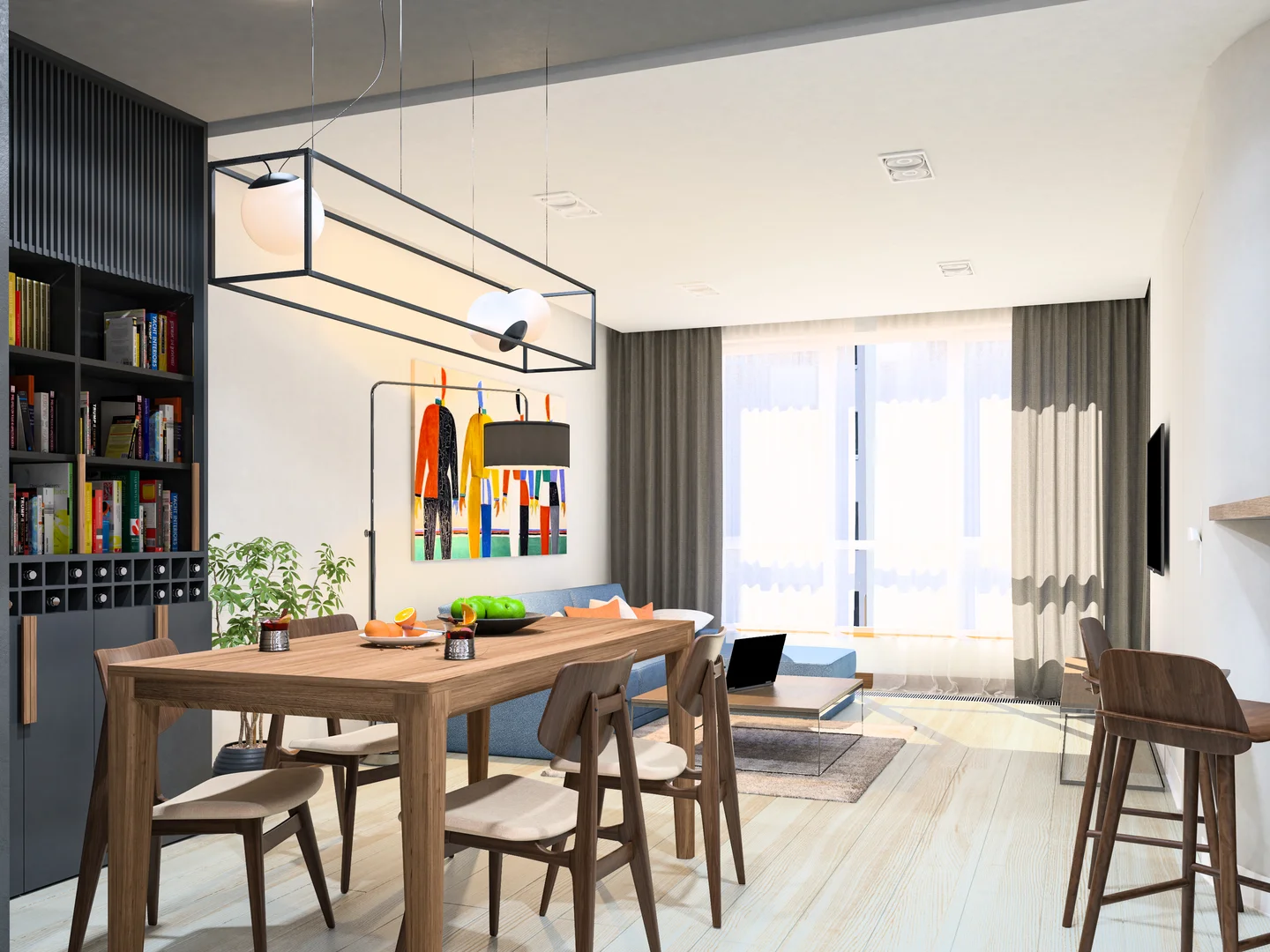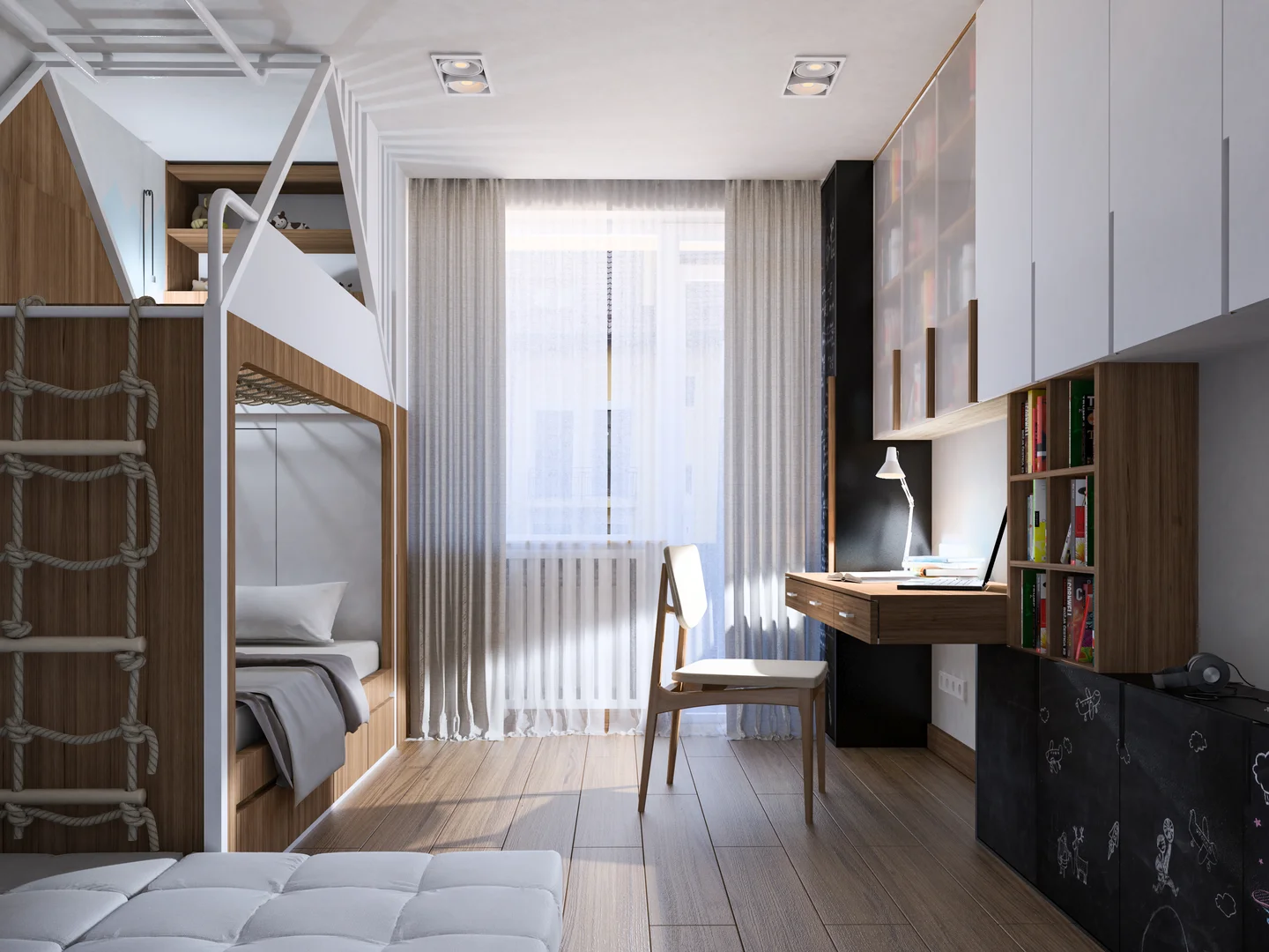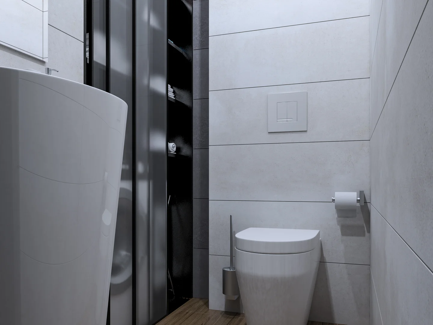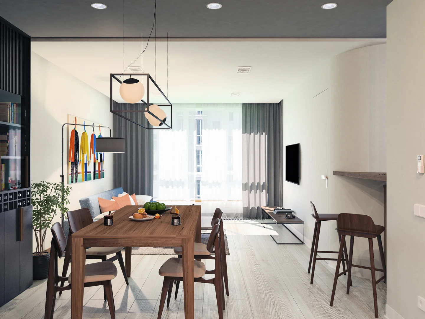 This minimalist apartment design features gently rounded walls and cabinetry, creating a light, airy atmosphere within a compact and carefully considered layout. The introduction of an additional bedroom required relocating the kitchen to the rear of the apartment. This constraint became an opportunity to explore a more expressive design approach, transforming the challenge into a distinctive rounded feature that defines the space.