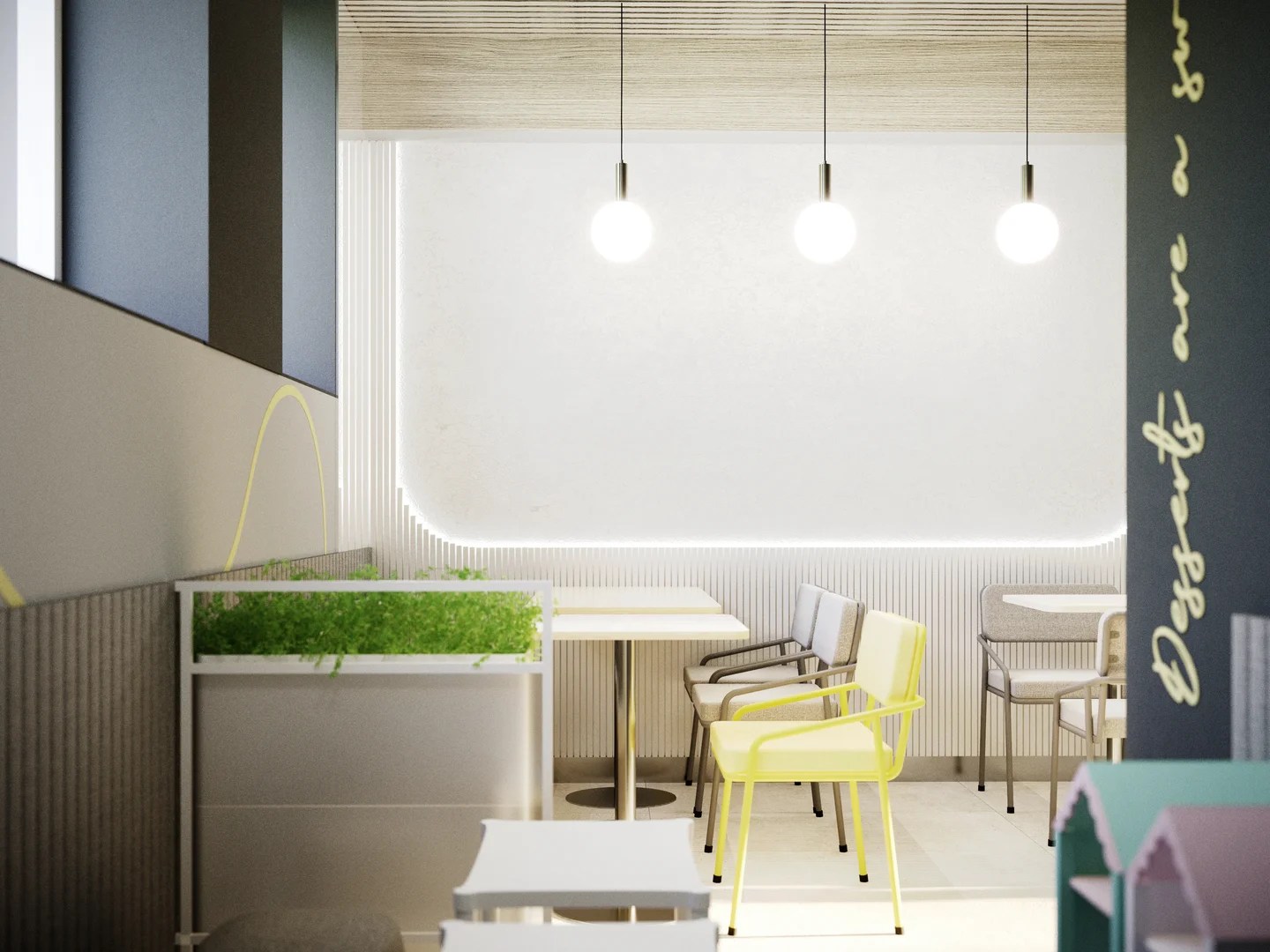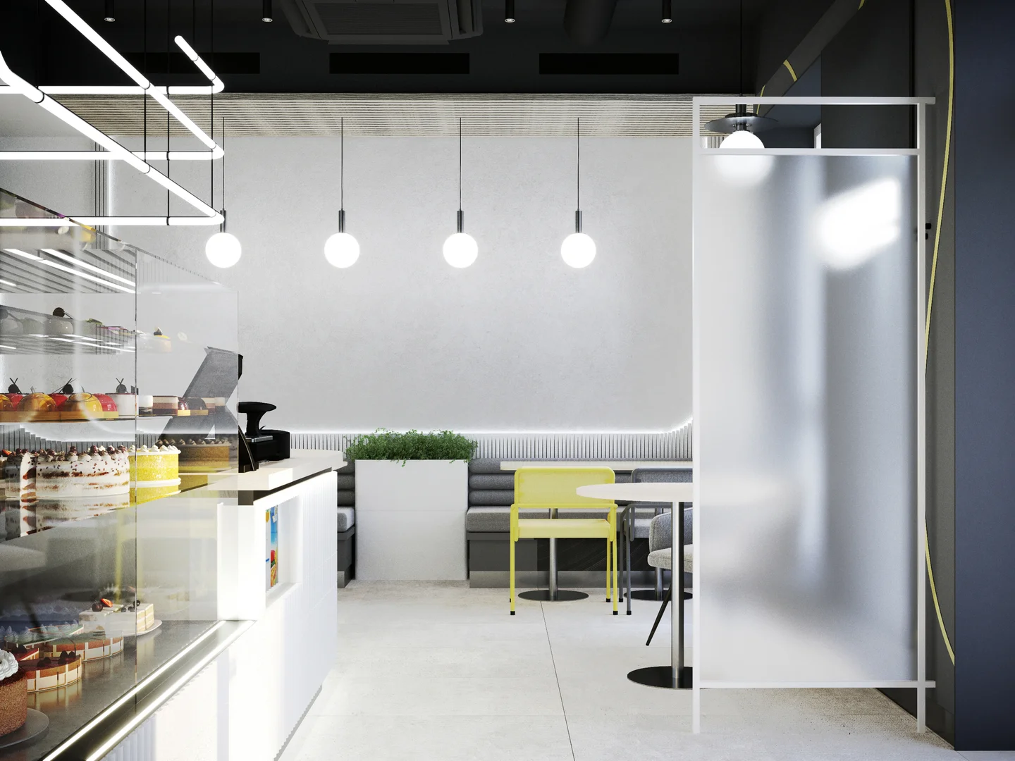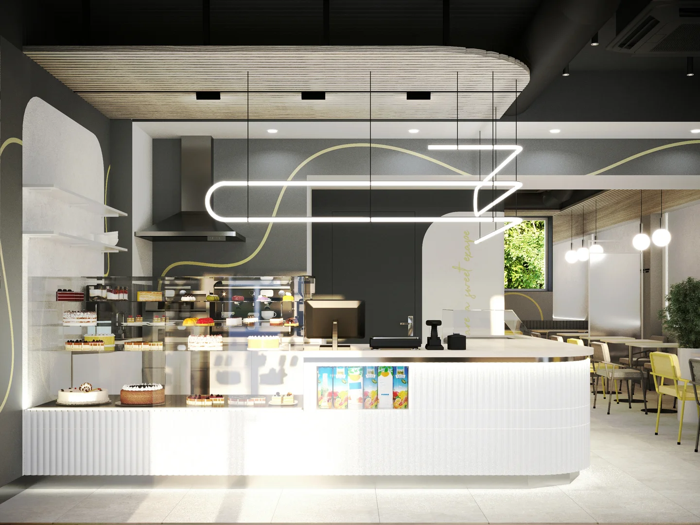 Designing a café-shop for a confectionery with a strict and clearly defined corporate identity presented a unique challenge. Despite these constraints, we introduced subtle and refined stylistic elements, creating a light, elegant, and inviting space that complements the brand while enhancing the overall customer experience.