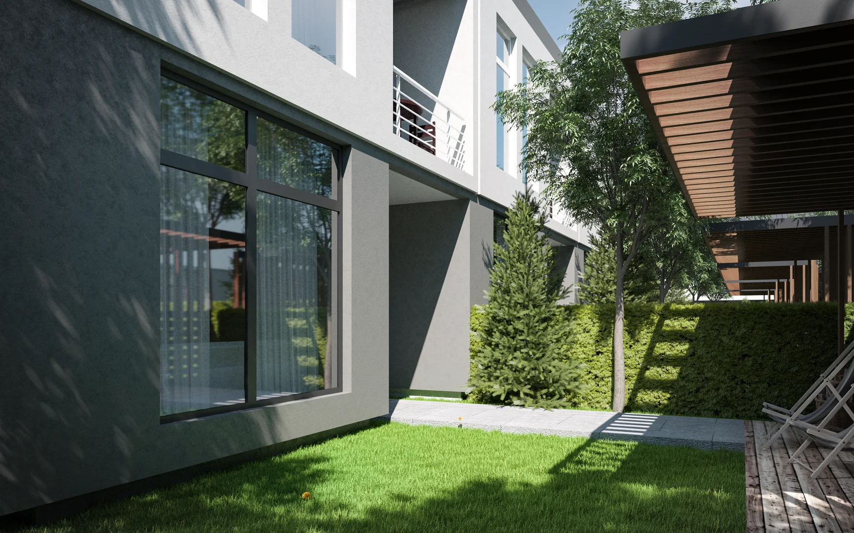 A residential complex that combines detached and semi-detached houses of various sizes. The ergonomic and concise planning of the buildings made it possible to effectively use the area of the land plot. Each cell includes a parking area as well as a yard. The laconic look and minimalist design gives lightness to the outlines of the complex. There are shopping areas on the corners.