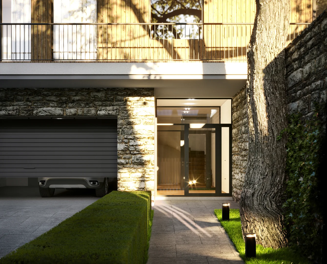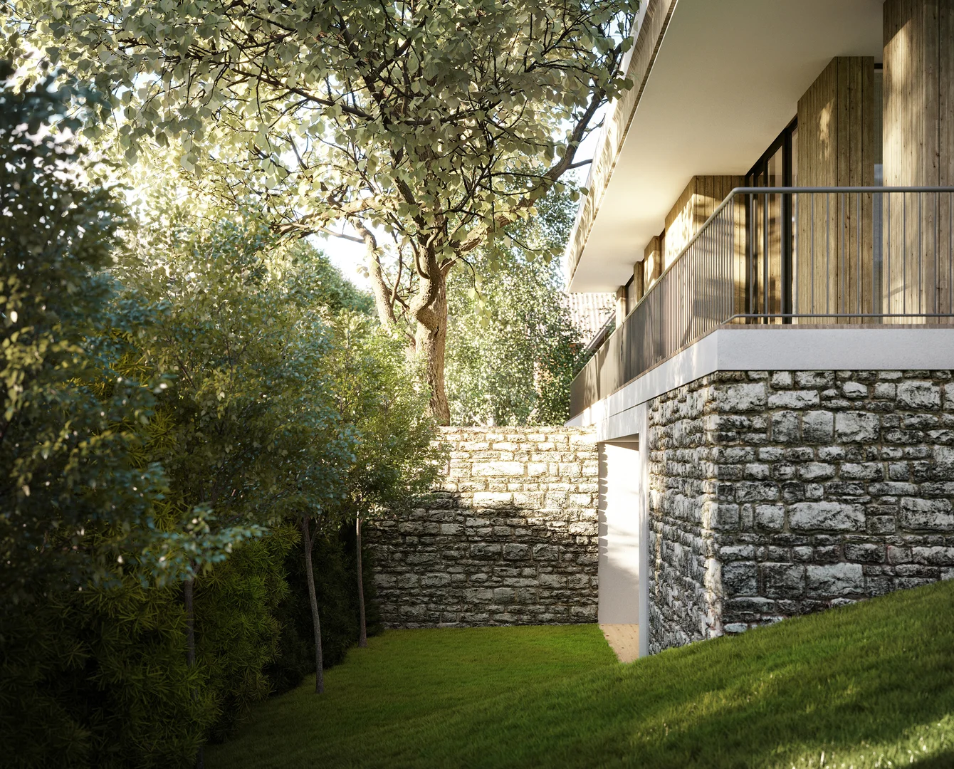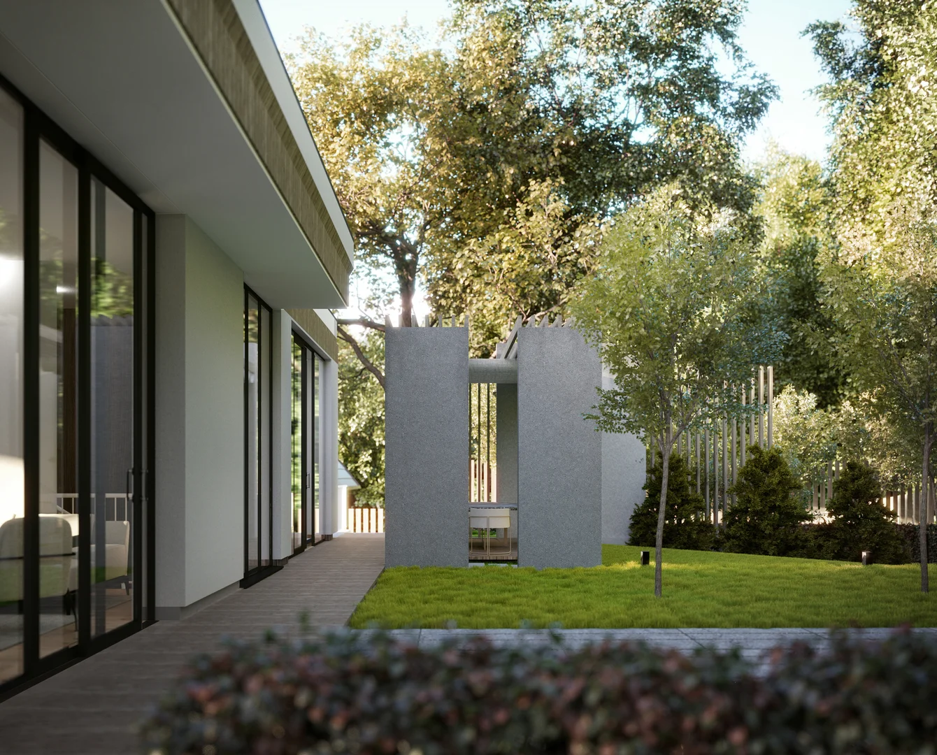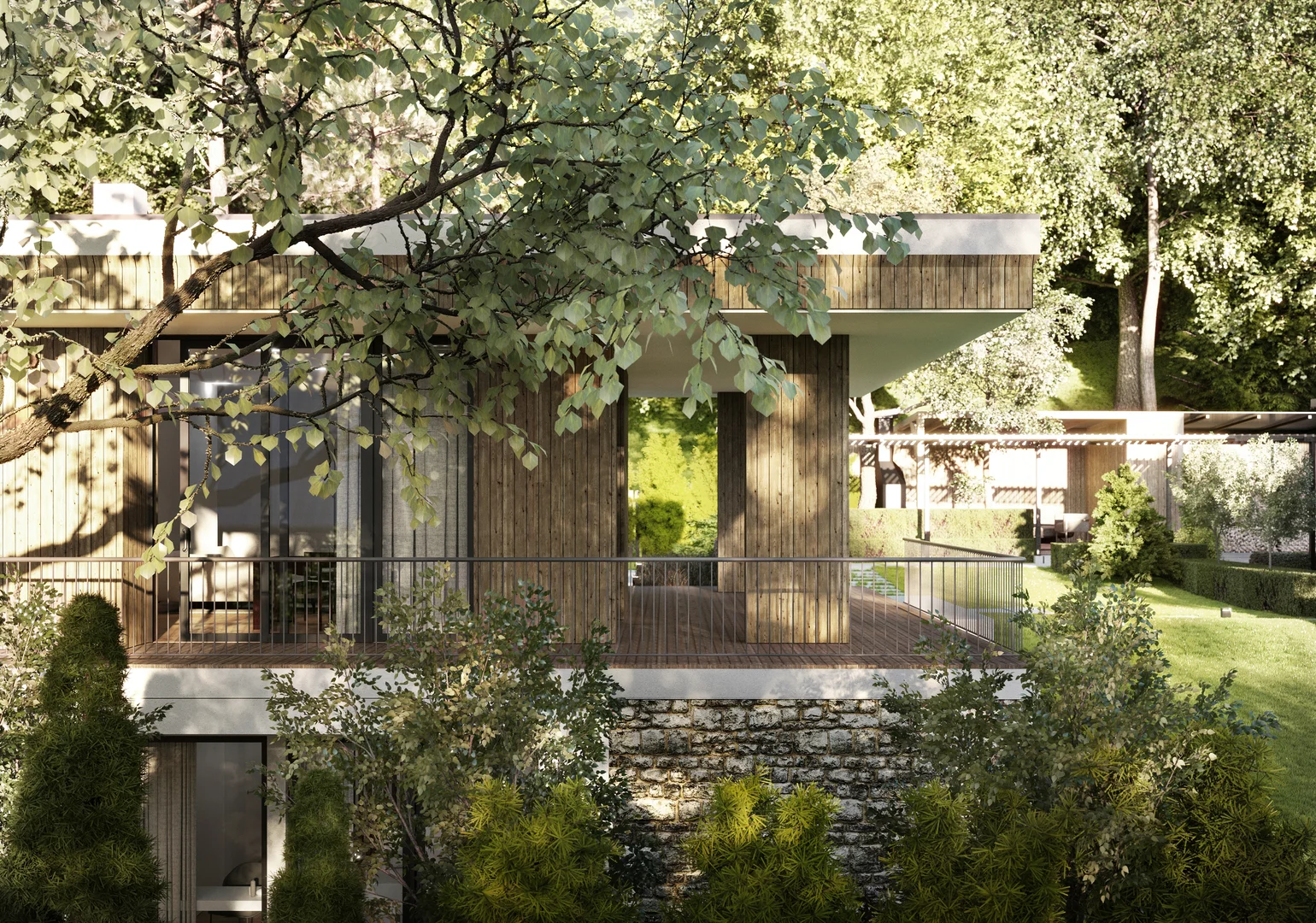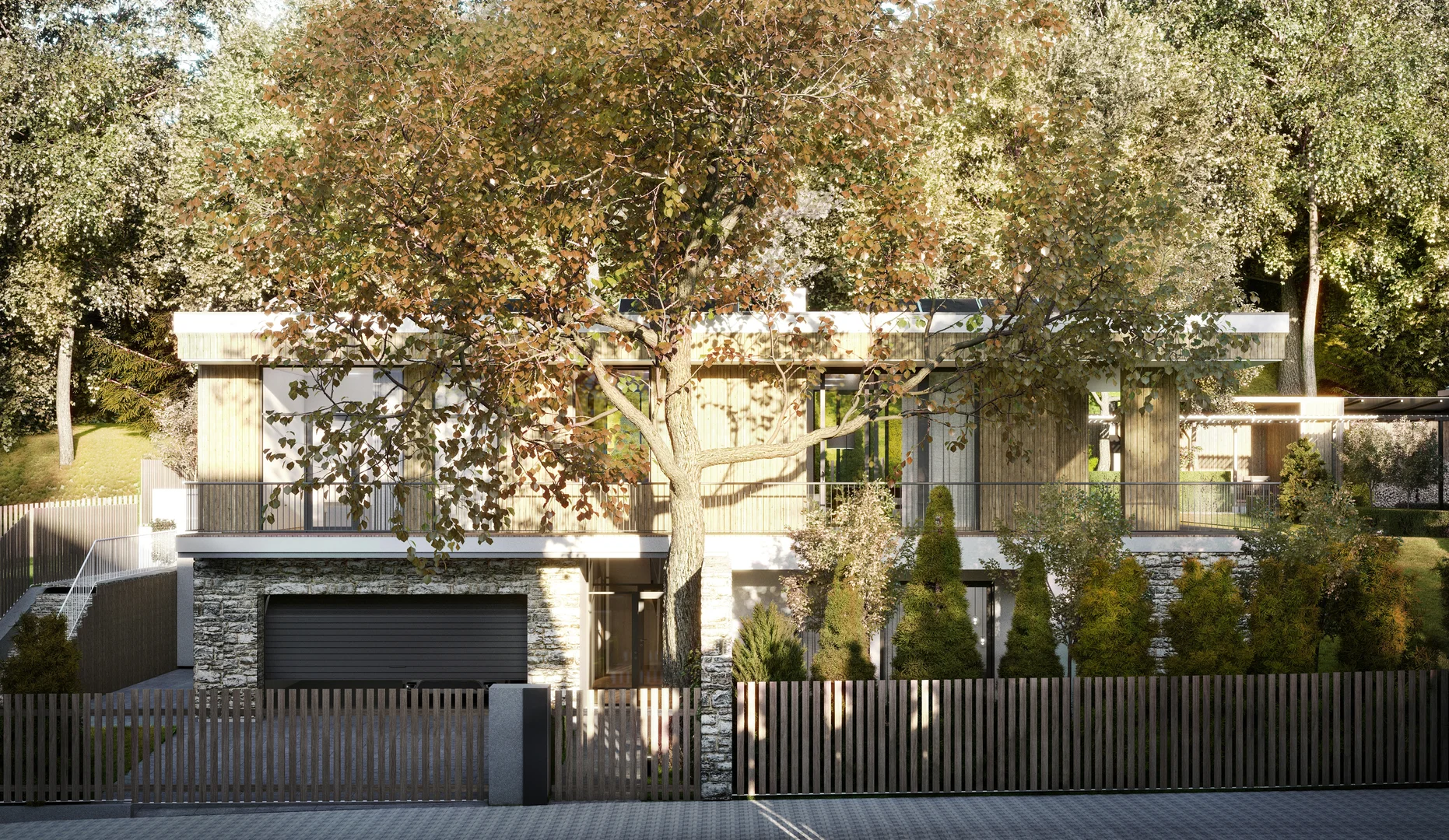 Цей проєкт передбачає вишукану приватну резиденцію, розташовану на похилій ділянці поблизу мальовничого лісу у Львові. Головний вхід розташований на першому поверсі; проте, завдяки ретельному терасуванню ділянки, житлова зона на верхньому рівні виходить на просторий мезонін, що посилює зв'язок між інтер'єром та ландшафтом. Загальною площею 120 м² планування продумано організоване на окремі зони, що забезпечує високий рівень комфорту та приватності як для батьків, так і для дітей, коли це необхідно. Мінімалістична архітектурна мова розроблена таким чином, щоб бездоганно інтегруватися з навколишнім середовищем, м'яко доповнюючи ландшафт.