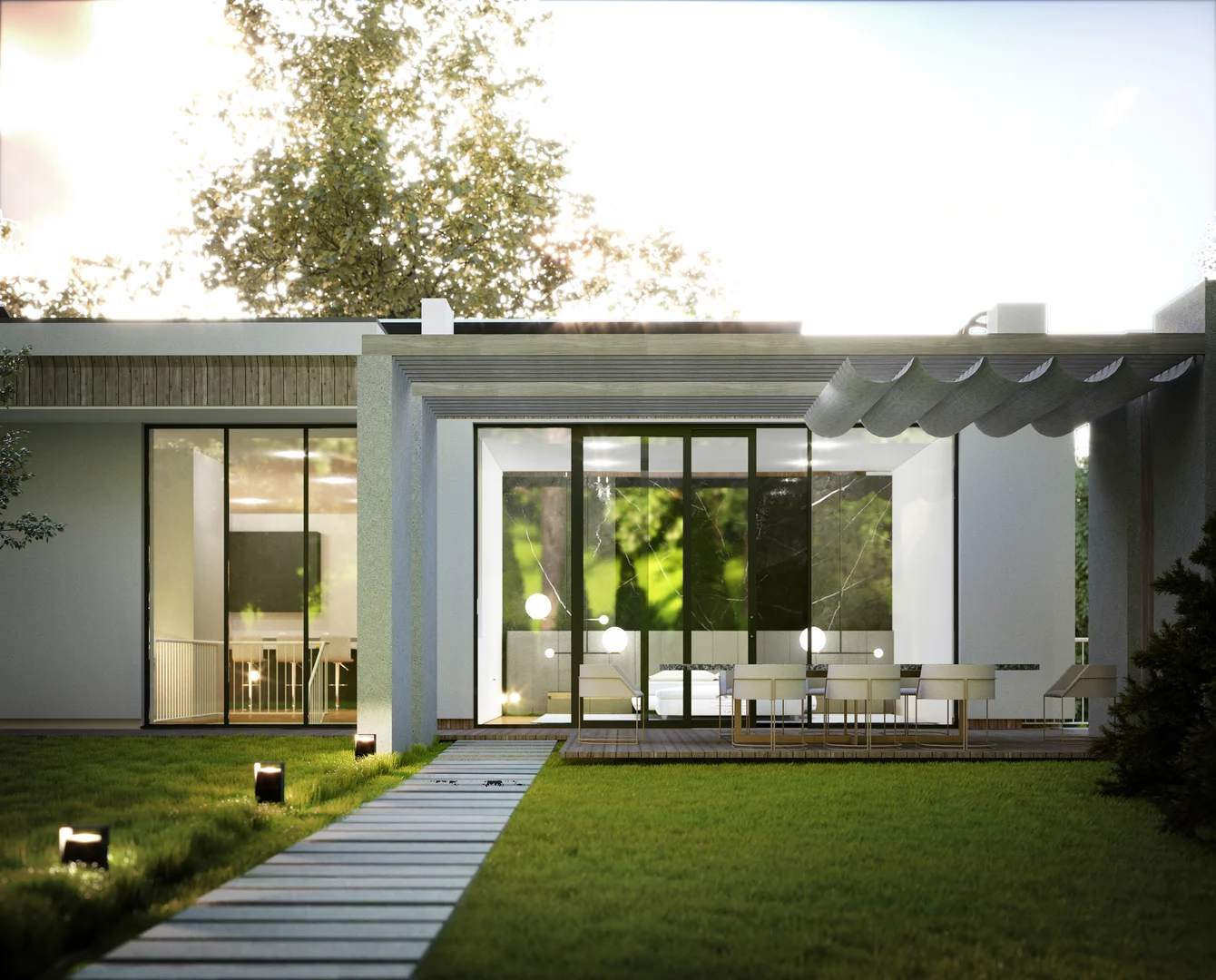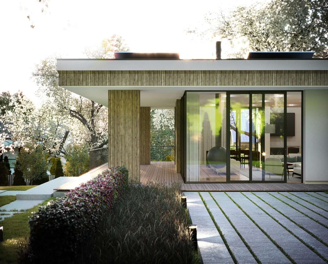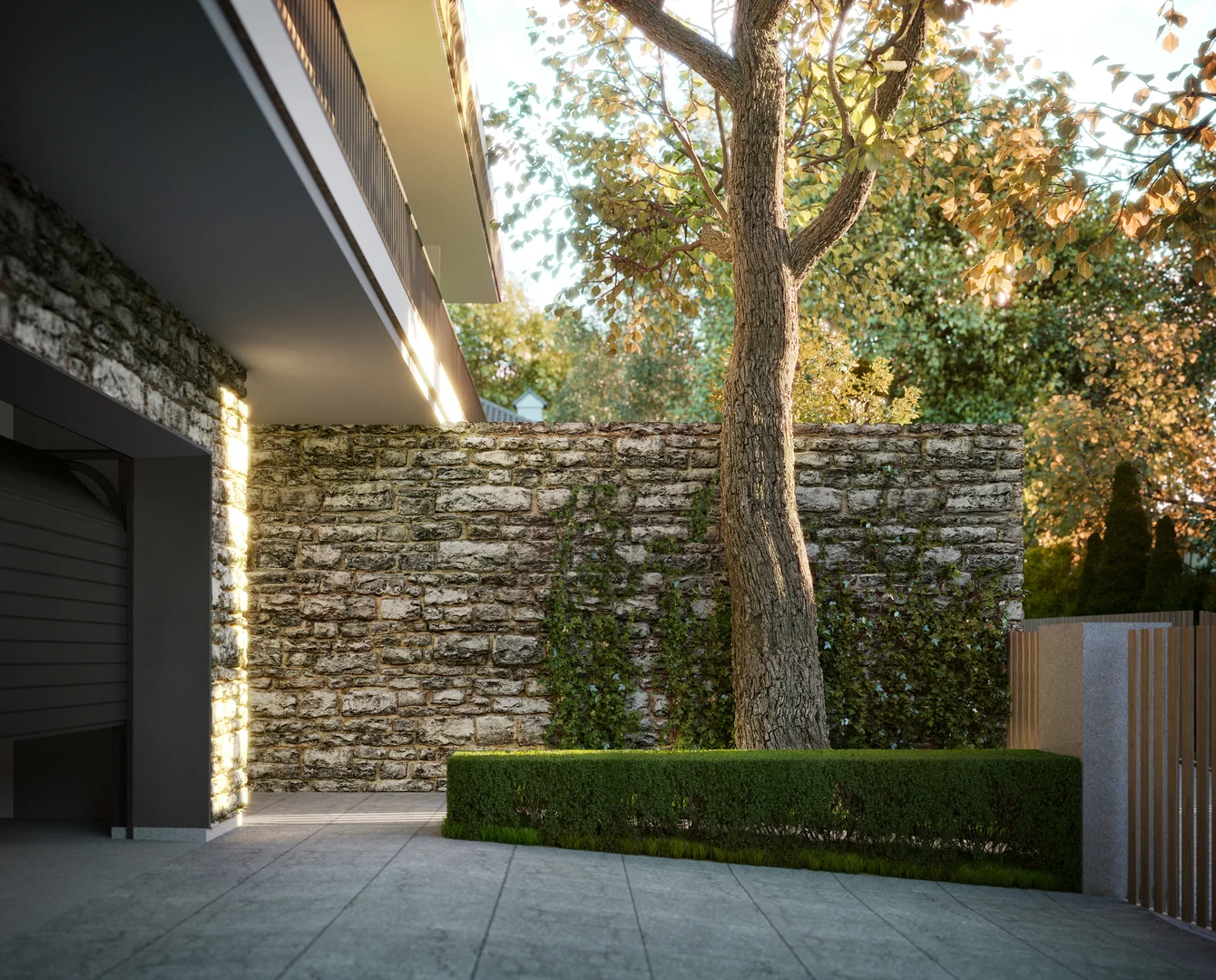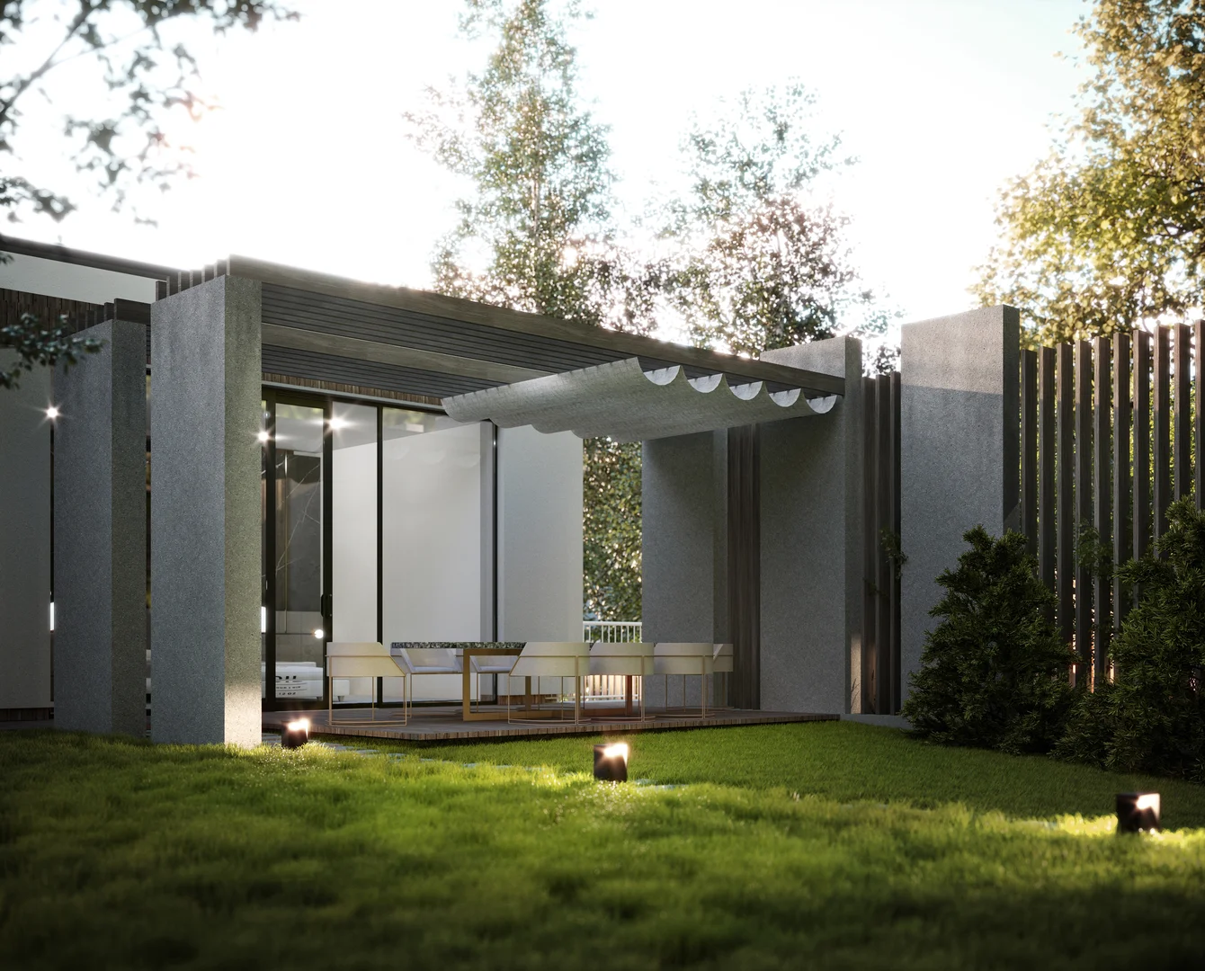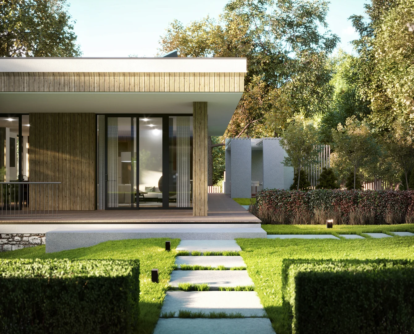 Цей проєкт передбачає вишукану приватну резиденцію, розташовану на похилій ділянці поблизу мальовничого лісу у Львові. Головний вхід розташований на першому поверсі; проте, завдяки ретельному терасуванню ділянки, житлова зона на верхньому рівні виходить на просторий мезонін, що посилює зв'язок між інтер'єром та ландшафтом. Загальною площею 120 м² планування продумано організоване на окремі зони, що забезпечує високий рівень комфорту та приватності як для батьків, так і для дітей, коли це необхідно. Мінімалістична архітектурна мова розроблена таким чином, щоб бездоганно інтегруватися з навколишнім середовищем, м'яко доповнюючи ландшафт.