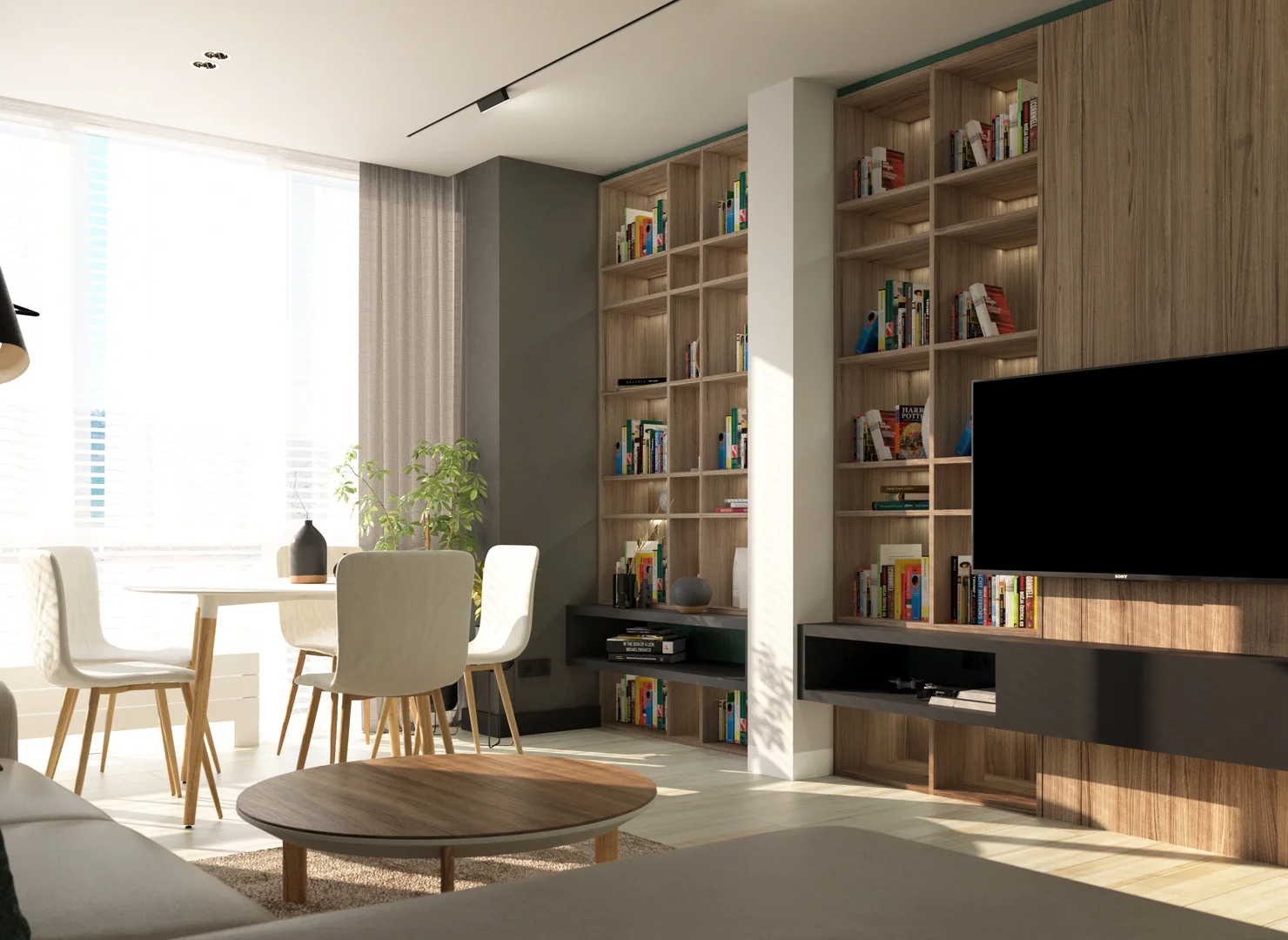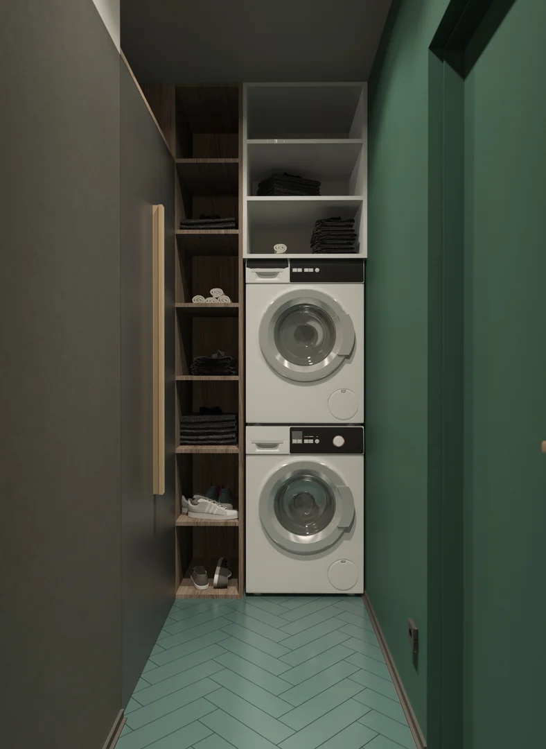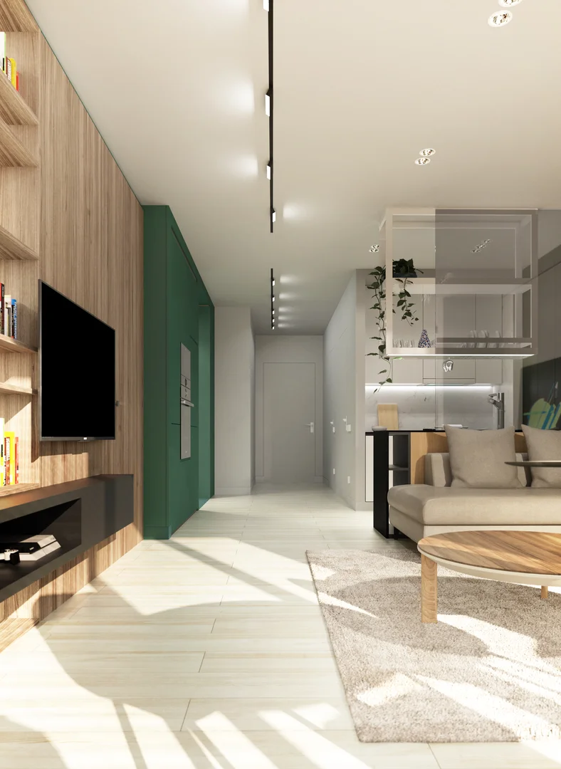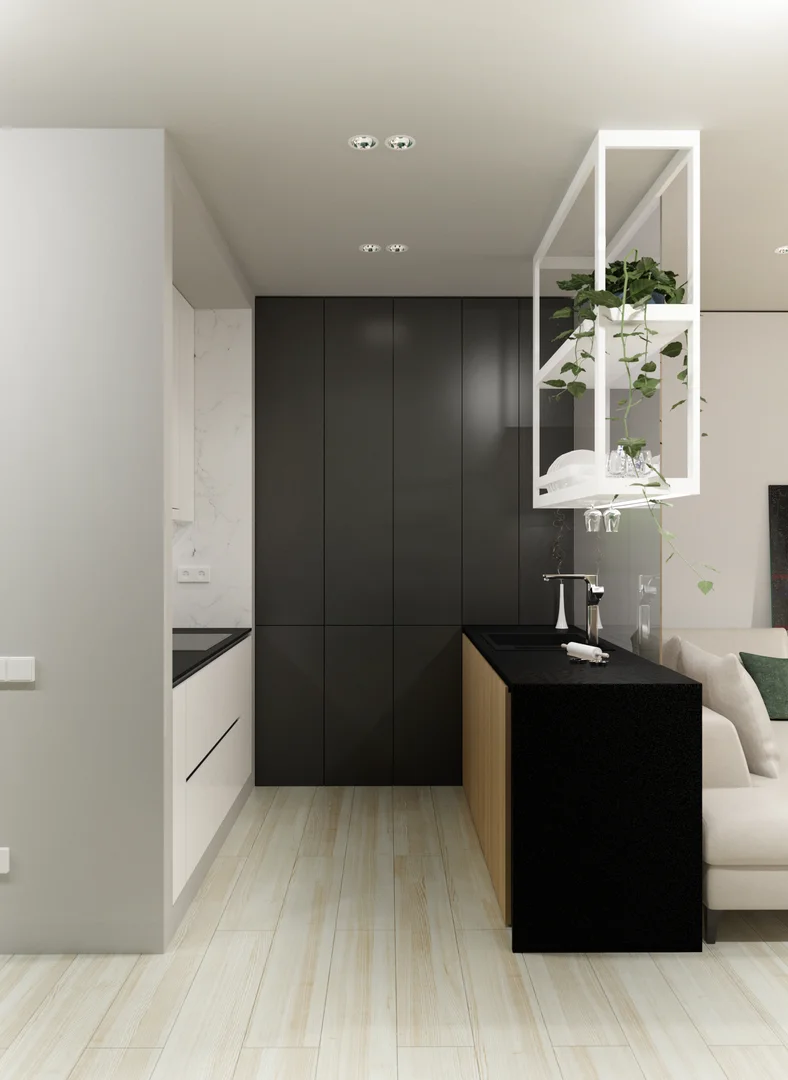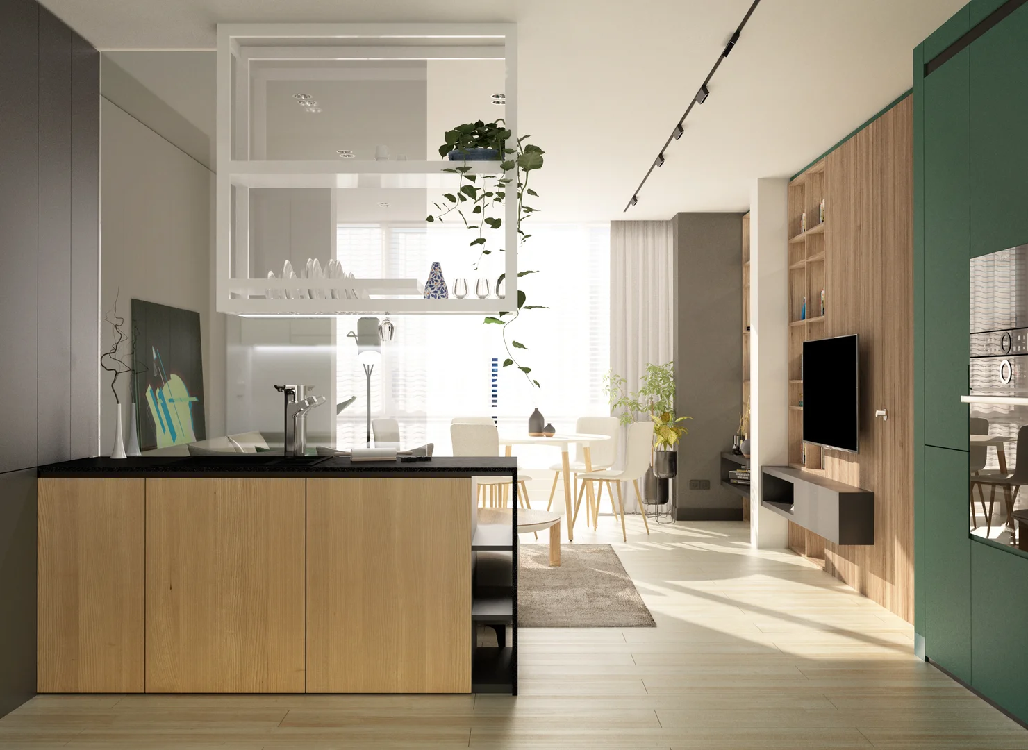 Необхідність перенесення кухні та додавання додаткової спальні призвела до створення високофункціонального планування. У цьому дизайні кухня стає невід'ємним елементом, що формує простір навколо акцентного ядра вхідної зони. Функціональність та естетика визначають суть цього проєкту.